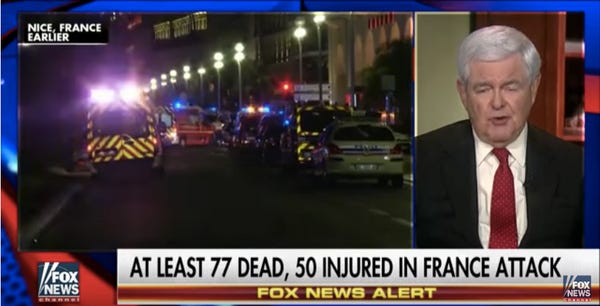 Is Newt Gingrich getting a little jealous over Donald Trump loving Mike Pence more than him? MAYBE! Perhaps that is why, last night, he got on the teevee with Mike Huckabee and promoted a very Trumpian (Trump-esque? Trumpish?) counterterrorism plan in light of the attack in Nice, France.