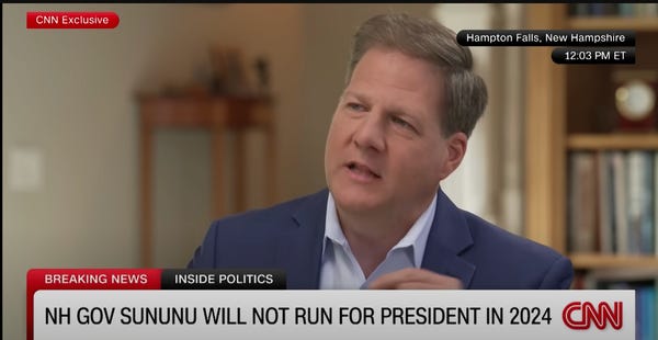 Republican New Hampshire Gov. Chris Sununu is officially not running for president. He's probably carefully studied the polls and realizes he'd just embarrass himself. He nobly doesn't want his one percent polling average to help Donald Trump run away with the nomination.