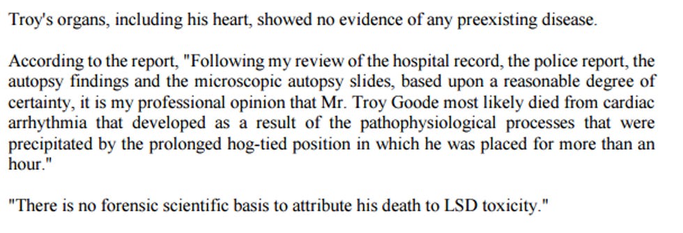Witnesses reported Goode was hogtied by officers as he was having an asthma attack, and that before he was shunted into an ambulance, he could be heard screaming, "I CAN'T BREATHE!" Police wouldn't let Kelli give him his inhaler. Later, they threatened to arrest her when she tried to inquire as to Troy's well-being in the hospital. Totally normal behavior. Within an hour of arriving at the hospital, Goode was dead.