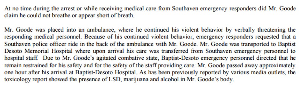 According to Desoto County District Attorney John Champion, a “preliminary autopsy,” which the media did not get to see, stated Goode died of some kinda somethin’ with his heart, or maybe his lungs, or maybe both — the presser on that report was mighty vague. Who conducted that "preliminary autopsy"? It's not clear. But Champion saw it, he promises. Maybe he was referring to the toxicology report, which WAS released, that showed Goode had weed and LSD in his system, but no other drugs that weren't administered at the hospital.