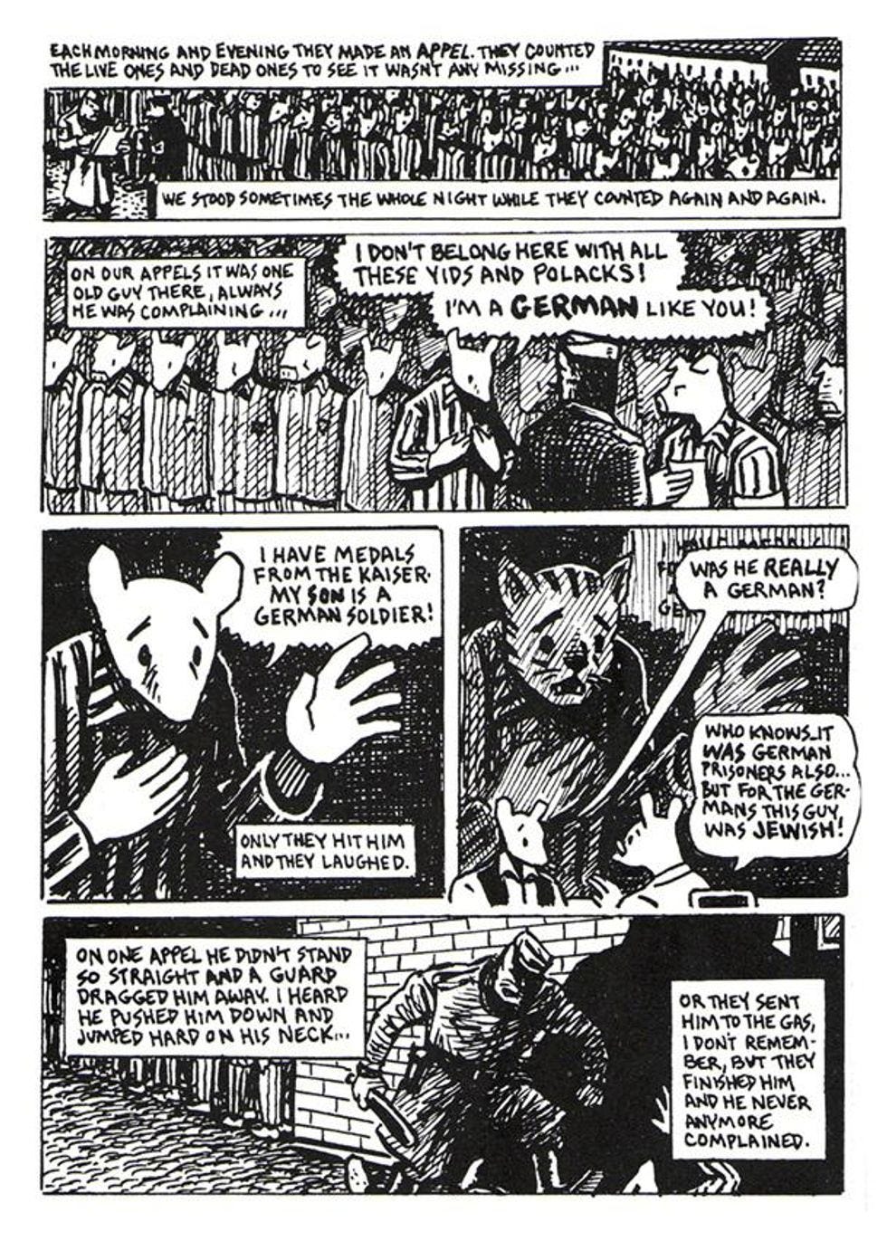 As the story progresses, Spiegelman also uses the cat/mouse imagery to make us question where we get these ideas of identity anyway. The second volume features a scene outside the book's main narrative, with Spiegelman talking to his therapist about the problems he's having with the work — but both are drawn this time as humans wearing mouse masks, to clearly distinguish that notions of identity can be both absurdly arbitrary and, in the context of Nazi Germany, deadly serious. A fair-use sample of how Spiegelman plays with that theme of identity: