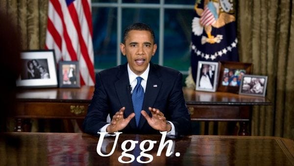 The reviews are in for the president's big Oval Office speech last night, and the consensus is "Meh, this is stupid, why did I watch this stupid thing, this is stupid." If the pundit class is bored of his speeches, can Obama really continue to be president? Probably not.