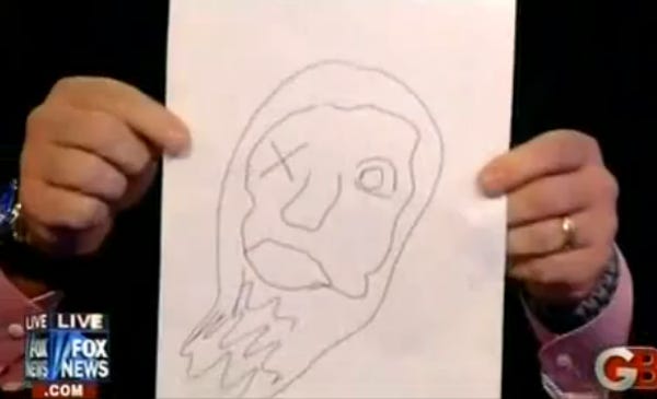Last night on Glenn Beck's sickly teevee show, the profitable conspiracy theorist host made a simple plea: for the government to release its photos of Osama bin Laden's corpse. Glenn would like to see it. And his argument was that the photos can't be all that gruesome, because most Americans have seenThe Godfather and children play violent video games. In fact, Glenn "worked all day" on this goofy little cartoon of bin Laden's shot-up head. And guess what? Beck is right. Not for the reasons he mentions, and certainly not for that dumb drawing, which makes bin Laden actually look cute. The reason President Obama should release the photos is because they will be more gruesome than movies or video games. And it is only fitting the photos live forever here on the most horrifying place in all the world: the Internet.