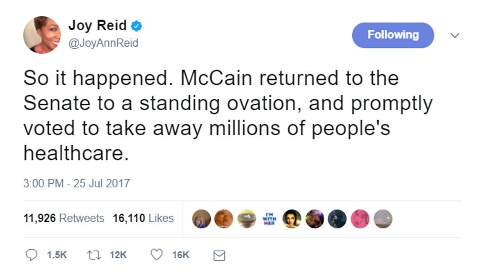 As McCain began his grandstanding speech on the Senate floor, we thought for a minute he was about to resign. "Holy shit, John McCain is about to make the final vote of his career one to fulfill Mitch McConnell's Turtle Wet Dream Fantasy of literally murdering people with the free market? What a trollop cunt!"