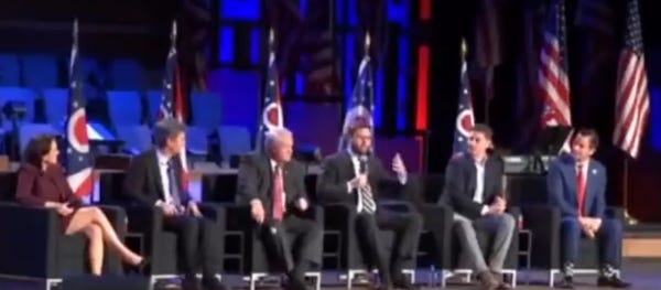 Conservative radio host Hugh Hewitt moderated the event at Westerville's Genoa Church. It was sponsored by the Center for Christian Virtue, and if that name actually meant anything, they wouldn't have invited most of the candidates, which included Jane Timken, former state GOP chair; Josh Mandel, former state treasurer; and J.D. Vance, current asshole. Also present were state Sen. Matt Dolan, investment banker Mike Gibbons, and car dealer Bernie Moreno.