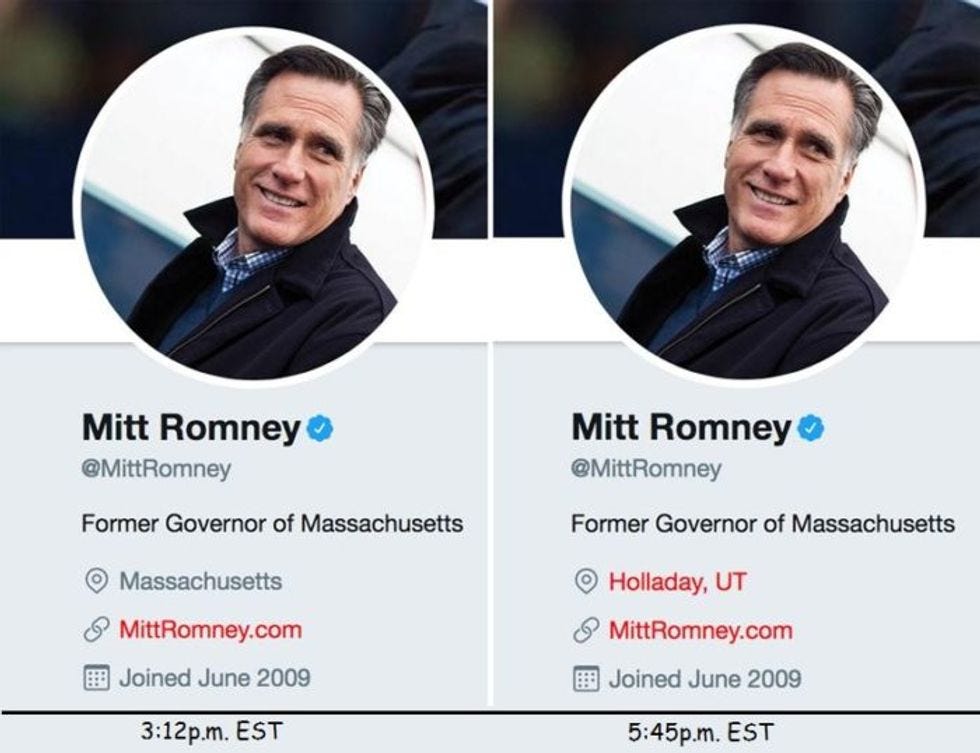 Hatch will be leaving the Senate even though Donald Trump and Steve Bannon have been pushing for him to stay forever -- as if he hasn't already done that -- because they don't want that liberal squish Romney in the Senate saying mildly unkind things about Donald Trump before voting with all other Republicans for tax cuts and dismantling the social safety net to sell to the lowest bidder. Romney -- apart from that purely coincidentally timed change of Twitter location -- hasn't made any public announcement yet of his plans, though he did post a generic "thank you forever for your service to the people of Utah and all us rich bastards" message on his Facebook.