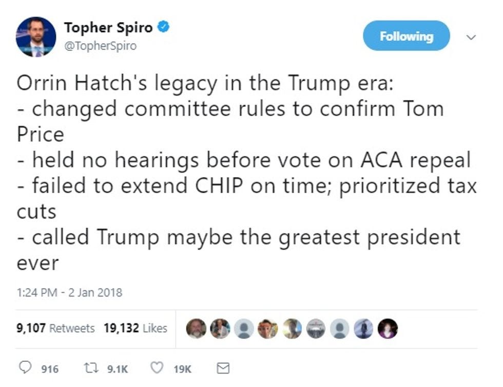 Topher Spiro of the Center for American Progress offers this overview of the legacy Hatch will leave behind, after having at least pretended to be bipartisan earlier in his career: