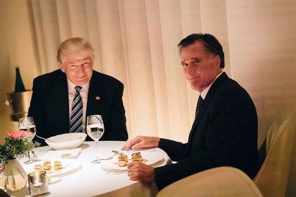We were especially glad to see WaPo sought out the thoughts of former Utah congressman Jason Chaffetz, who, following the Pussy Tape, bravely and tearfully said he couldn't bring himself to endorse Trump because oh, how could he look his daughter in the eye -- then went right ahead and supported Trump. After a year of presumably avoiding looking at his daughter, Chaffetz said he thinks Romney and Trump could work together, since, after all, Trump "considered" Romney for secretary of State during the transition. Like Trump "considered" preserving Obamacare and the Paris climate accord. But if Romney somehow makes it into the Senate, says Chaffetz, Trump better know Mitt won't be any pushover, no way!
