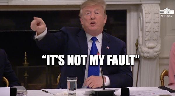 Despite pledging that he alone can fix "it," Trump is failing miserably at every campaign promise, according to a new analysis in WaPo. The few signature policies he has been able to enact, such as court packing, baby jails, and his tax cuts (for the super rich) have forced the economic analysis to project an economy in doom and gloom as US trade and housing markets slump thanks to stagnant wages, a lack of affordable housing, Trump's trade war, and a 35 day government shutdown on top of all the useless neo-nationalist rhetoric being injected into political discussions. Of course, Trump says, "It's not my fault," and blames his failures in North Korea, his Muslim ban, the border wall, repealing the ACA, and inability to reinvigorate the Midwest manufacturing sector are all the fault of ... someone else.