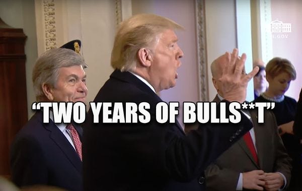 Puerto Rico might be be starving for food stamps, but Trump apparently didn't get that memo as he was busy yelling at congressional Republicans. During a self-invited victory lap on the Hill, Trump railed about "two years of bullshit," NATO, NAFTA, Obamacare, the Green New Deal, and then complained the amount of aid the US gave the island territory after Hurricane Maria was too damn high, erroneously claiming the US sent $91 billion, and adding the whole country could have been bought four times over.