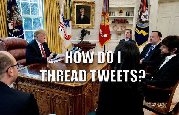 On Sunday Twitter nuked about 5,000 pro-Trump bot accounts spewing "the phrase "RussiaGate hoax" on Mueller Day last week. According to nerds and security officials, the accounts seem connected to Saudi Arabia and Egypt, and whoever was operating the accounts was trying get the phrase into Twitter's trending topics. As usual, Trump was pissed about losing "followers" and summoned Twitter's fuckwit douchebag CEO, @Jack Dorsey, to nerdsplain bots and cyber fuckery. The two of them then tweeteda bad photo and some horseshit about creating an open dialogue.