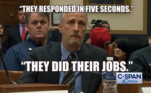 Jon Stewart ripped a subcommittee of the House Judiciary a new asshole yesterday during a hearing on a bill to fund benefits for 9/11 first responders. Stewart chastised the "indifference" from Congress, saying that members should be "ashamed"of themselves, then singled out the subcommittee's ranking Republican for questioning Congress's ability to fund the program in five years."They did their jobs with courage, grace, tenacity, and humility," an angry and emotional Stewart said. "Eighteen years later, do yours!" Shortly after the hearing, Stewart told CNN, "These are the most honored and venerated amongst us, and if we can't take care of them, what chance do the rest of us have?" [ Video ]