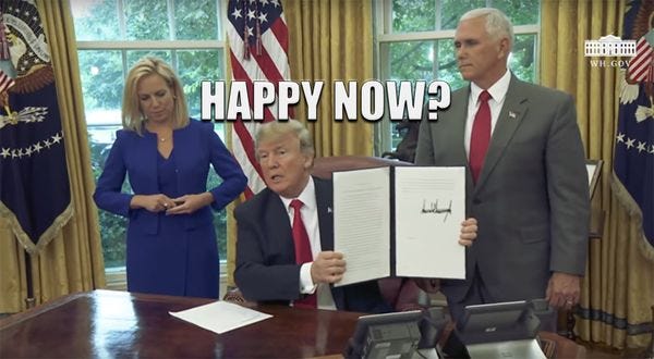 Trump bragged about his meeting on the Hill as a carefree and joyous event, however Trump held a rally in Minnesota with a bunch of conspiracy theorists where he mocked protesters, promoted North Korea, bitched about HER EMAILS, fear mongered about MS-13, and called Nancy Pelosi the she-devil. He ranted about being "tough" on the border, but was noticeably silent about his baby jails.