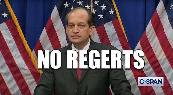 With calls growing to be "You're Fired"-ed, Labor Secretary Alex Acosta came to give an eight minute statement and 45 minutes of Q&A with reporters where Acosta said his office did nothing wrong. Instead of apologizing for his sweetheart deal with convicted sex offender Jeffrey Epstein, Acosta blamed Epstein's all-star cast of TV lawyers, the "scared and traumatized" underaged victims for not coming forward, and engaged in some whataboutism by throwing attorneys from Palm Beach County under the bus. Acosta did not offer any semblance of an apology, or imply he had regrets helping Epstein, an ALLEGED serial pedophile running a child prostitution ring, serve out his slap on the wrist sentence at home and Club Fed. [ Fact Check ]