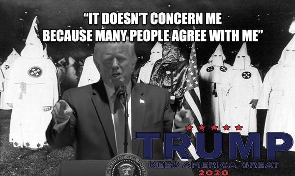 ICYMI: Trump doubled down on his overtly racist tirades against four progressive women of color in the House yesterday. During the third annual "Made in America Showcase," Trump said his critics, informally known as "The Squad" on the Hill, "hate our country" and should "go back" to "broken and crime infested places where they came from" (places like The Bronx , Boston , Minneapolis , and Detroit ). Trump then accused one of the first two Muslim women in Congress of being an anti-Semite who was sympathetic to al-Qaeda, much as he previously accused former President Barack Obama of being an African-born terrorist who personally founded ISIS. The Washington Post notes that only a fun-sized handful of Republicans have grown a spine and denounced Trump's latest racist shitposting and verbal diarrhea, but most waited 24 hours to issue their half-assed condemnations. A number of other Republican legislators have since appeared on TV to make their own racist comments. Politico details how Trump's minions have been twisting themselves in knots in an attempt to reframe Trump's latest bigoted hate speech, despite photographers capturing images of his handwritten notes. "Alcaida."