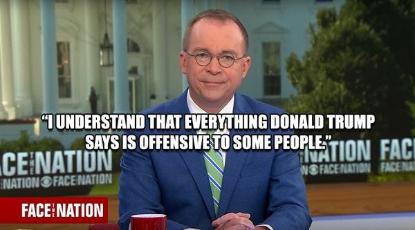 Acting White House chief of staff Mick Mulvaney defended Trump's latest racist tirade on several Sunday shows this weekend. On Face the Nation, Mulvaney said he understood that "everything that Donald Trump says is offensive to some people." In an interview with Fox News's Chris Wallace, Mulvaney, who last year bragged to a room full of bankers about taking money from lobbyists while serving as an obstructionist Tea Party zealot in the House, stated that he'd "be fired" from his gerrymandered district in majority white and ruralSouth Carolina if he had "poverty," and "crime," and "homelessness" like Baltimore and Chicago. When Wallace suggested there was "a clear pattern" of bigotry in Trump's statements, Mulvaney argued that Trump was "fighting back" and that Wallace was "spending too much time reading between the lines." [ Video / Transcript ]