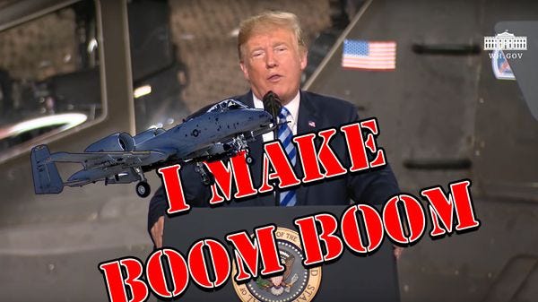 Rather than a routine signing of the $716 billion 2019 military spending bill (named after ailing Republican Sen. John McCain), Trump held a political rally full of military members where he snubbed McCain (again), bragged about Mike Pence's "Space Force," (again), insulted the press (again), bragged about his trade war (again), and barely remembered to givea half-assed endorsement to some Republicans facing tough elections (again).