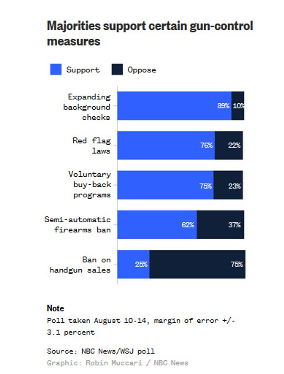 A new NBC/WSJ poll shows a hell of a lot of support for gun control legislation. Among the highlights, 89 percent support background checks, 76 percent support so-called "red flag" laws, 75 percent support a gun buy back program, and 62 percent support a ban on assault weapons. Additionally, about half the country thinks Trump's response to the mass shootings in Texas and Ohio was totally fucked, and 55 percent of people are "very worried" about the threat of another white nationalist attack targeting immigrants and/or brown people.