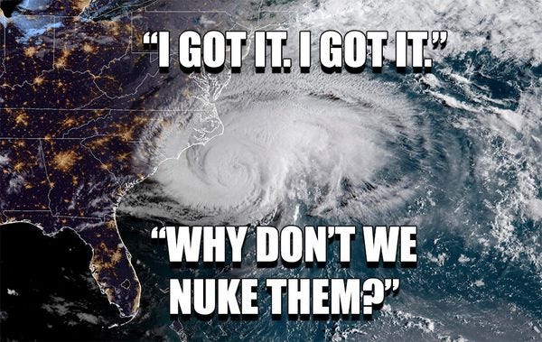 Axios gossips that Trump has on multiple occasions suggested we bomb hurricanes into smithereens. According to aides, during one hurricane briefing Trump suggest we "nuke them," causing the lackey to comment, "You could hear a gnat fart in that meeting. People were astonished. After the meeting ended, we thought, 'What the f---? What do we do with this?'" Some science bitches over at NOAA have a memo on why this is a catastrophically stupid idea, and NatGeo has a 2016 article about how this is a bad idea left over from the Eisenhower era that just won't die (because people are dumb).