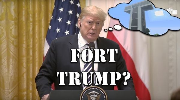 In an effort to convince Trump to create a permanent military base in Poland, Polish President Andrzej Duda suggested calling the base "Fort Trump" during a press conference yesterday. Trying to hide the toadstool growing in his pants, Trump then rambled inarticulate nonsense about NATO countries spending money for protection.