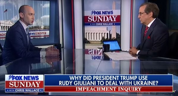 Trump World spent the weekend on a full-bore media offensive in an attempt to gaslight people after Ukrainium One blew up in their faces. Trump went nuclear on social media, declaring impeachment "unlawful," demanding House Intel Committee Chair Rep. Adam Schiff be investigated for "treason," and regurgitating Fox News talking heads 22 times saying his impeachment would lead to "civil war." Meanwhile, Republican Sen. Lindsey Graham went on Face the Nation to say he had "zero problems" with Trump's phone fuckery, and Stephen Miller scuttled out of his dungeon to get humiliated on Fox News by Chris Wallace when he dodged a bunch of questions and tried to assert Trump was the REAL whistleblower. Rep. Jim Jordan went on CNN and got fact-checked by Jake Tapper. The actor Jon Voight shitposted a video declaring "war," and last night Trump posted a video whining about fighting for his Front Row Joes. This morning Trump shitposted that Rep. Adam Schiff should be tried for treason for investigating him. 'Cause that's how treason works. [ Face the Nation / Fox News Sunday / State Of The Union ]