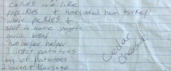 This is a happy household! If I had a mother who sent me for instant potatoes, and then said, "now go get us a bag of potatoes" I'd find that very funny, as a kid and as a grown-up. It's no fun to have a mother who's efficient and says, "I bought instant potatoes already-- I'd hardly buy a bag of potatoes, what's wrong with you?" Those mothers are a dime a dozen. It's so unusual-- all you can do in response is point out you're better than her?? I love her saying, "that cake we like." Cosy. Now you're all six years older and you agree with me.