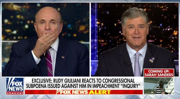 After he was subpoenaed by three different House committees yesterday, a very sane and sober Rudy Giuliani went on Hannity to call Joe Biden "a crook" and ramble some weaselly bullshit about "weighing the alternatives" to testifying, then said he had gathered "evidence in the form of "video tapes and tape recordings." LORDY, there are tapes!