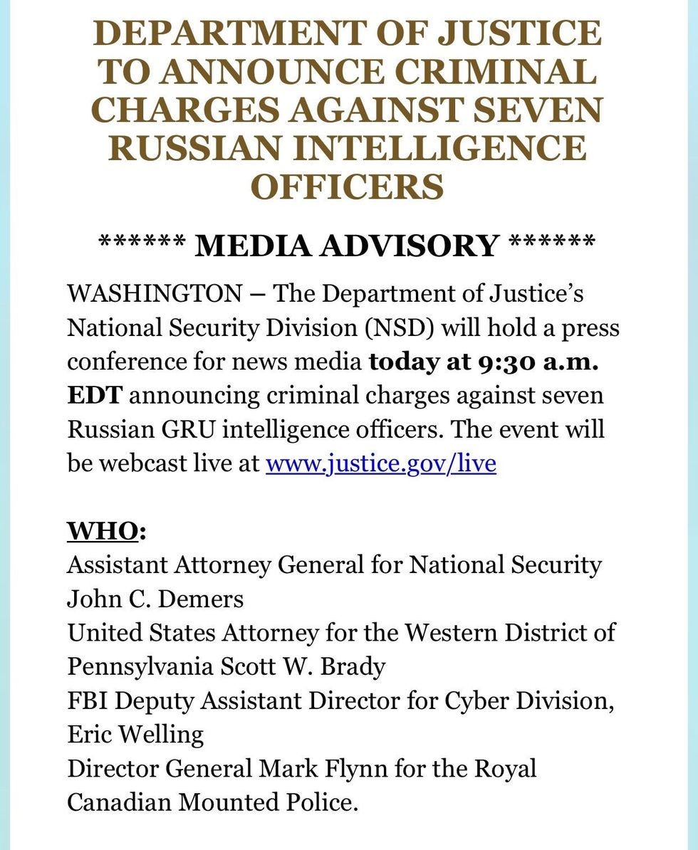 BREAKING NEWS: The DOJ is expected to announce indictments of more Russian GRU intelligence officers at 9: 30 AM EST.