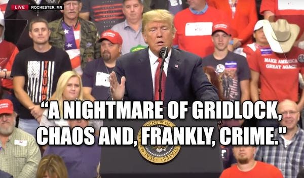 At a rally in Minnesota, Trump railed against former Sen. Al Franken for folding "like a wet rag" after reports surfaced that he sexual harassed people. Trump also railed against Franken's replacement, Sen. Tina Smith and the state's Democratic Gov. Mark Dayton, and projected by calling Democrats "the party of crime." Trump then rambled about thebig win he got with sportsball by getting Canada to air Stupid Bowl ads (yes, that was actually part of NAFTA 2 ).