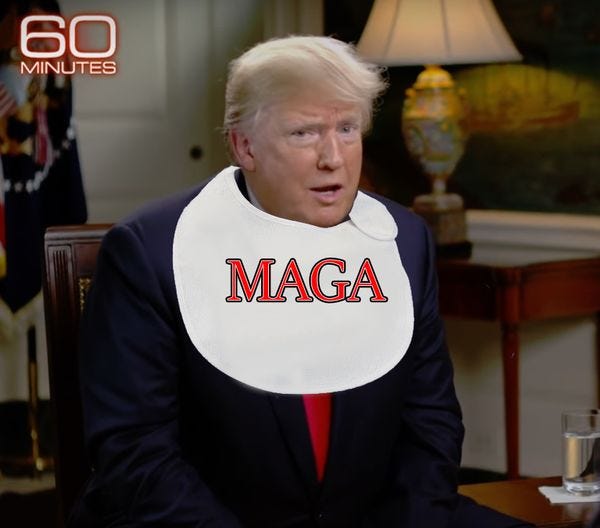 Trump sat down with 60 Minutes' Lesley Stahl and bullshitted his way through another interview where he failed to accept any responsibility for his administration's unending series of blunders or his own personal screw-ups. Trump also blatantly lied about his trade war with China, ignored political assassinations of journalists and critics in Saudi Arabia and Russia, insulted Dr. Christine Blasey Ford (again), brushed off his "love" for dictators, accused China (not Russia) of election hacking, whined about the Fed, shrugged off any legislation on climate change, bitched about NATO, and defended his baby jails by saying, "I'm president and you're not." [ Transcript and Video ]