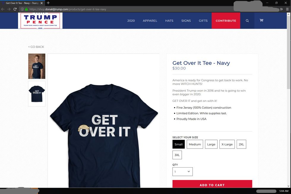 It's brazen and stupid crap, Trump's 2020 team is selling t-shirts that say "Get Over It." I'm not a lawyer, but I don't think it's smart to sell swag that can be used as admission of a crime.