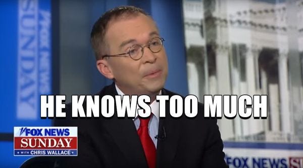 Mulvaney spent the weekend trying to clean up all the shit he threw at the fans in Trump World on Thursday. In an interview with Chris Wallace, Mulanvey denied the quid pro quo scheme he's already publicly admitted, complaining that he "didn't speak clearly maybe." Mulvaney then made things even worse when he said Trump "still considers himself to be in the hospitality business" when he tried to defend Trump's decision to hold the 2020 G-7 at his own gaudy Miami trash palace. The rumor mill on the Hill is Jared Kushner is leading an angry mob to get Mulvaney quit-fired, but there's some in Trump World who fear Mulvaney knows too much. [ Video ]