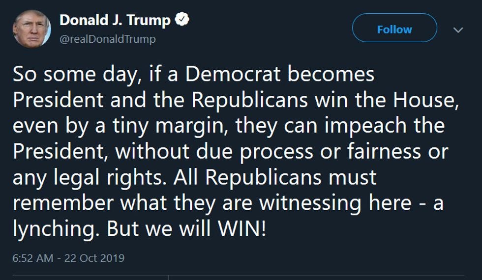 CNN reports that Democrats' timeline to #IMPEACH the motherfucker will likely see a vote towards the end of the year (as opposed to Thanksgiving) now that Ukrainium One is unraveling in full view of Crom, the Universe, and the rest of #Merica. The scuttlebutt, according to NBC, is that some Democrats are hoping for very narrow impeachment article(s), while others want to lump Robert Mueller's Trump-Russia conclusions into the whole shebang as well.