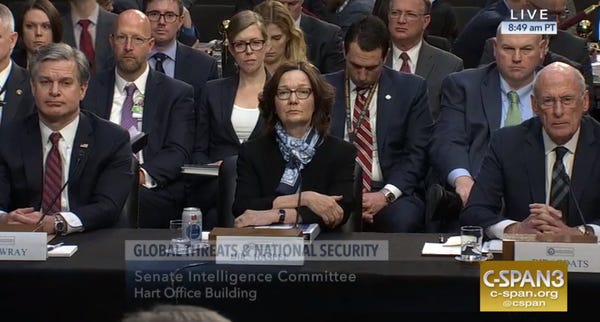 To read the Worldwide Threat Assessment from Trump's intel people, click here, and to watch the hearing, click here. Both present a fairly sane and normal real-world assessment of what's going on out there in the foreign lands, one which could just as easily have come from Obama's intel people, for the most part. And while you're reading and watching, just remember that whatever those chiefs say, Trump believes the opposite to be true, because he's a fucking idiot and also a wholly owned subsidiary of the Kremlin.