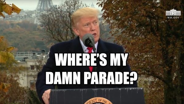 Trump's holiday in Europe was big, fat mess after he was forced to stand in the cold rain with a bunch of foreigners who don't speak American talking about dead people. Instead of getting some kick-ass military parade with tanks, and jets, and dudes with guns, Trump had to sit stand in a cemetery for Armistice/Veterans Day, then sit there as Not American leaders talked shit about him TO HIS FACE. Can't wait for Russia to tell us all about the instructions Vladimir Putin gave him.