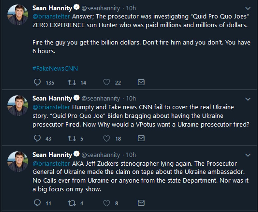 Brian Stelter has a great story breaking down how Sean Hannity was never sucked into the periphery of the imploding Ukrainium One scandal -- he's been at the center the whole time. Hannity has since fired off a couple of shitposts at Stelter, so it must've struck a nerve.