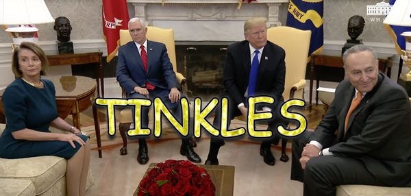 WaPo reports that Republicans are NOT HAPPY with Trump's Oval Office meltdown with Chuck 'n' Nancy, particularly because it happened on camera. There's concern that Trump played himself in admitting his eagerness to accept responsibility for another government shutdown over his goddamn wall. Reports about his off-camera tantrums aren't exactly helping either, as the LA Times notes, forcing Trump to prepare his base for the possibility that Mexico might not pay for the wall after all. Whoa if true.