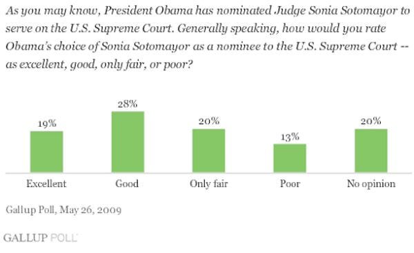 This Gallup poll was conducted Tuesday, the day of Sonia Sotomayor's announcement, so the Average American should have had plenty of time to comb through and analyze Sotomayor's legal opinions before discriminating between "good" and "only fair." [ Gallup ]
