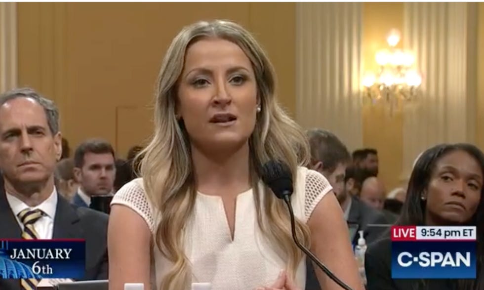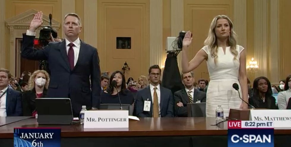 Tonight's witnesses will be Trump's deputy national security advisor Matthew Pottinger and former deputy press secretary Sarah Matthews, both of whom resigned on the day of the Capitol Riot. In her taped deposition, portions of which were aired in prior hearings, Matthews described chaos at the White House as aides urged the president to make a statement condemning the violence and urging his supporters to go home. Instead, the president watched television, even remarking that perhaps Pence "deserved" to be hung.