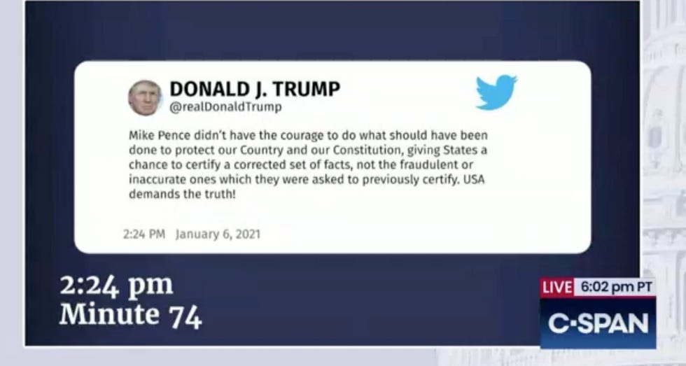 8: 15Cheney is going back over all the ways Trump tried to do coups, including the fake electors scheme, the 65 bullshit lawsuits, and the attempt to weaponize the Justice Department. But when none of that worked, he unleashed a violent mob.