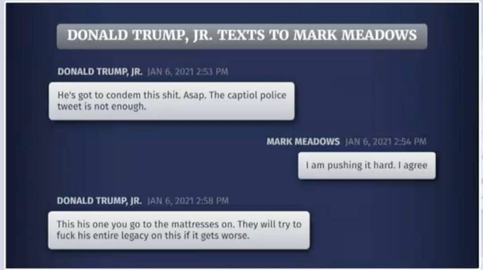 Meanwhile, Don Jr. and Sean Hannity wer panic-texting Mark Meadows to get Trump to call off the mob.
