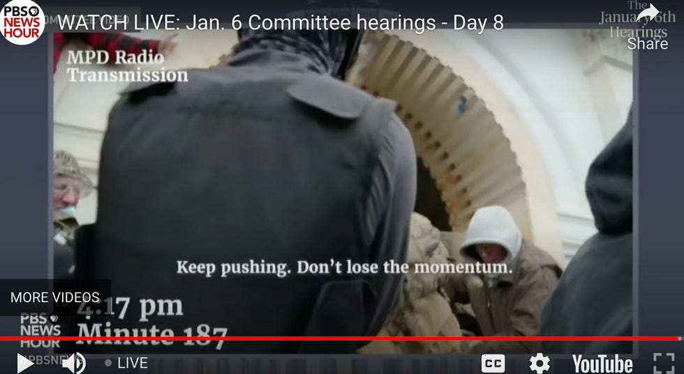 They're playing video of interviews with members of the crowd, including Oath Keeper Jessica Watkins, who is now charged with seditious conspiracy, in full body armor, at the moment Pence said he wasn't going to do what Trump wanted and illegally overturn the election.