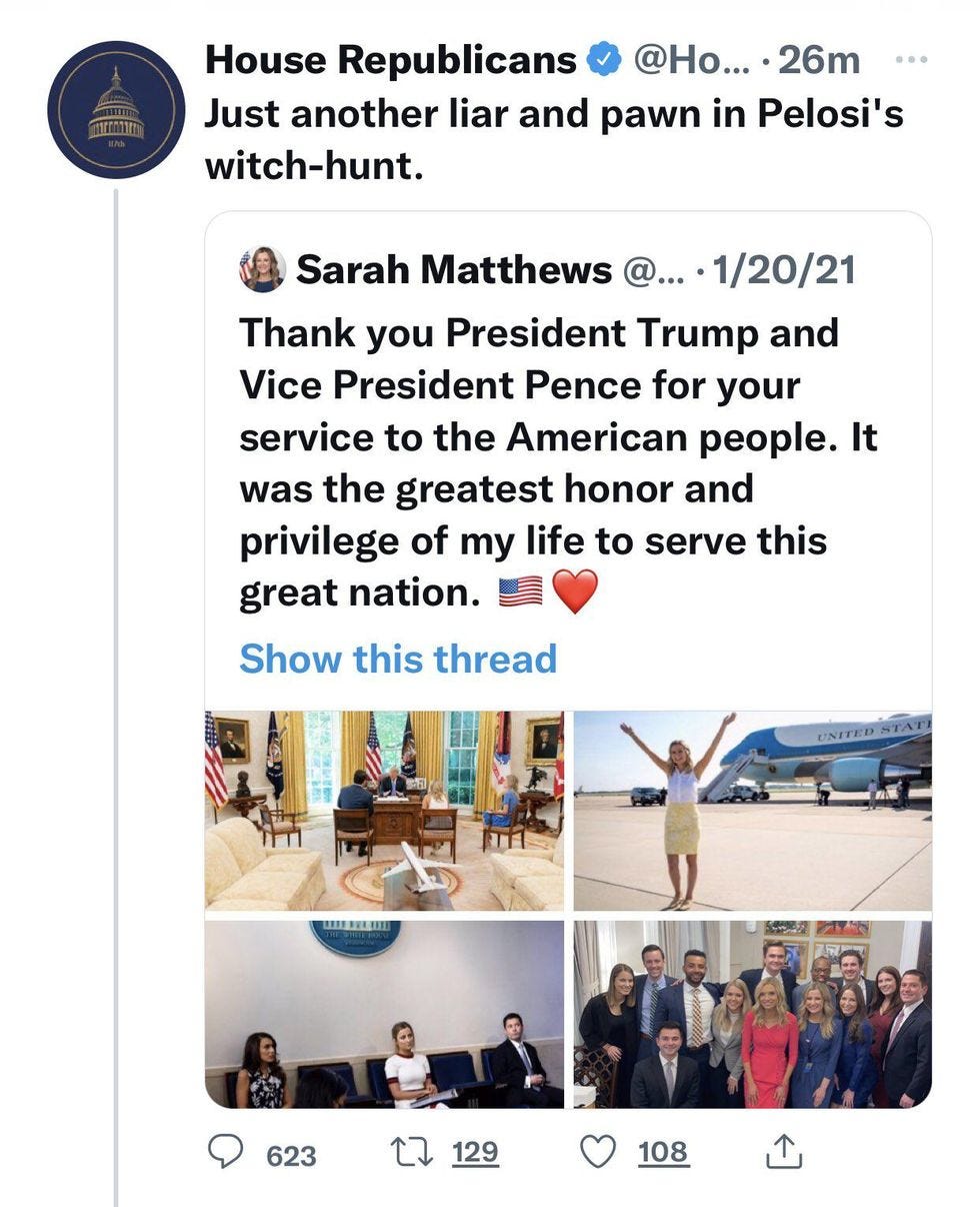 9: 10As we watch heartfelt footage of White House staff saying how upset they were about the tweet, the House GOP is attacking Sarah Matthews.