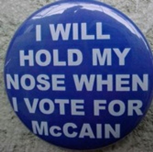 Nothing says "Ha ha, enjoy your black president next year" like this "I WILL HOLD MY NOSE WHEN I VOTE FOR MCCAIN" button sold on a Republican trinket website. There are many other sad and unintentionally hilarious gewgaws for sale at RepublicanMarket.com, but this is the only known example of wingnuts paying two dollars for the privilege of announcing in public that they are repulsed by their only 2008 presidential candidate. [ RepublicanMarket.com via Metafilter ]