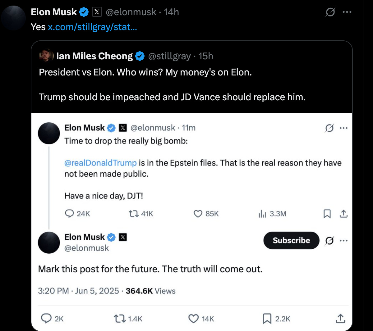 Then Elon upped the ante in his own way, saying hey, know why you haven’t seen the Epstein files? Because that dirty bitch Trump is IN ‘EM.