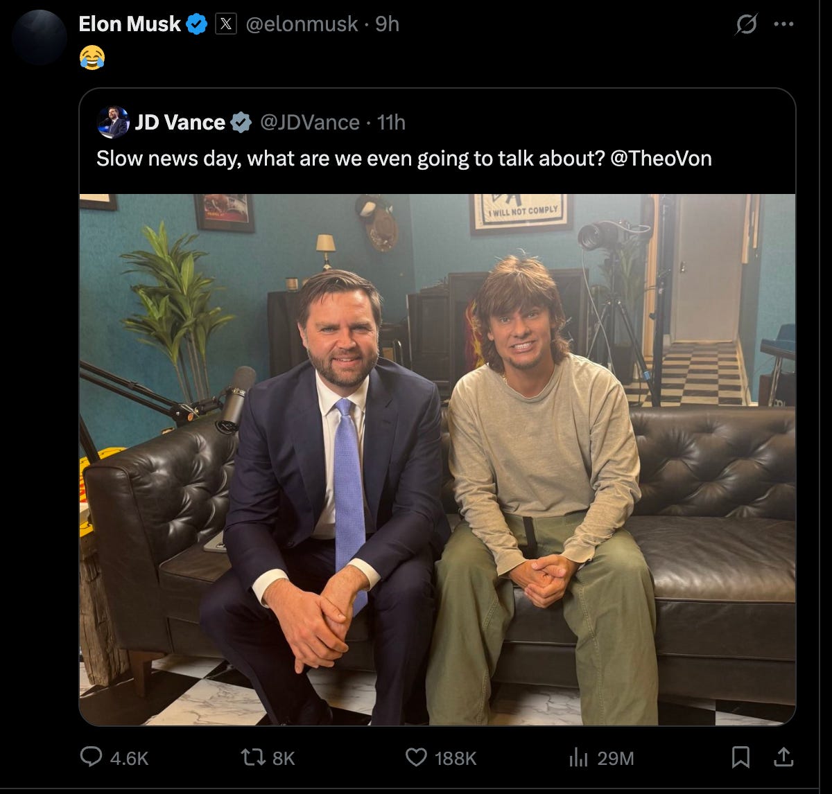 Throughout the day, Elon also predicted Trump’s tariffs would cause a recession, retweeted more about Epstein, and retweeted this picture of … JD Vance having a threesome with that hairball Theo Von and a couch? He used the laugh-y crying emoji? Also, is Theo Von developing Mar-a-Lago Face?