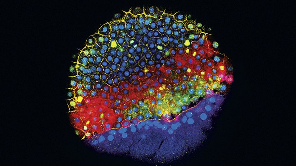 A zebrafish embryo at an early stage of development. Fluorescent markers highlight cells expressing genes that help determine the type of cell they will become. Jeffrey Farrell, Schier Lab/Harvard University