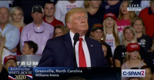 Trump started to single out Omar for scorn, because the very small portion of his brain that can count realized that one is less than four. Trump is a bully and doesn't like fair fights. During one of his hate rallies in Greenville, North Carolina (I grew up in the better Greenville), the president's Frankenstein mob broke out into chants of "SEND HER BACK!" like the former Somalian refugee was a pair of ill-fitting shoes from Zappos.com. Trump later claimed he was shocked and disappointed with the crowd's repulsive xenophobia. That was a transparent, easily disproven lie. Advanced videotape technology showed Trump pausing to bask in the warm glow from his supporters' anti-Omar sentiment.