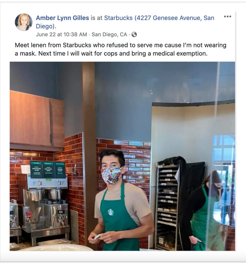 Amber Lynn Gilles showed up at a San Diego Starbucks this summer with her face hanging out during a pandemic. She refused to wear a mask inside, despite the city's public health requirements. She thought she'd film the masked “sheeple" buying lattes while caring whether other people live or die. Barista Lenin Gutierrez refused to serve her dumb ass, and she posted a video on social media “calling him out." She thought this made her a white, maskless, and stupid Rosa Parks.