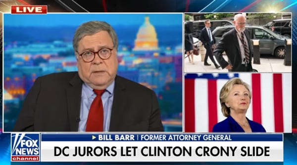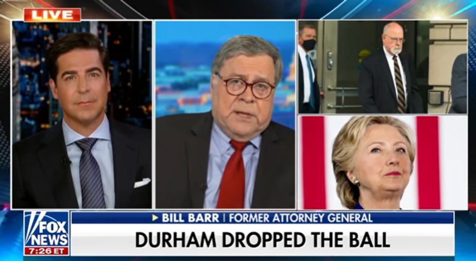 The rest of the Barr interview isn't worth your time, he just whines and moans and acts like the Durham investigation is going FINE JUST FINE, and will still get the evildoers, just you wait. Also, the DC jury was rigged because they are all gay married to Hillary Clinton. But look how mad Fox News is, y'all: